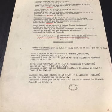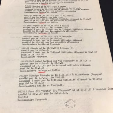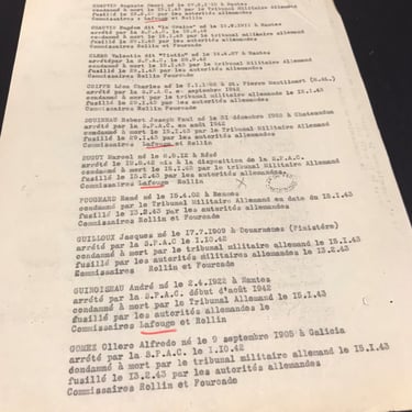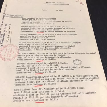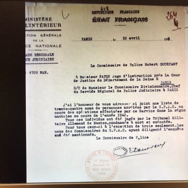 Oficio de la Policía Judicial francesa, fechado en París el 10 de abril de 1943, en el que el comisario Robert Courtant remite a un juez una lista de 34 personas detenidas por la SPAC en la región de Nantes durante 1942. Informa de que todas fueron juzgadas por el Tribunal Militar Alemán, condenadas a muerte y ejecutadas, indicando además qué comisarios franceses participaron en cada investigación.