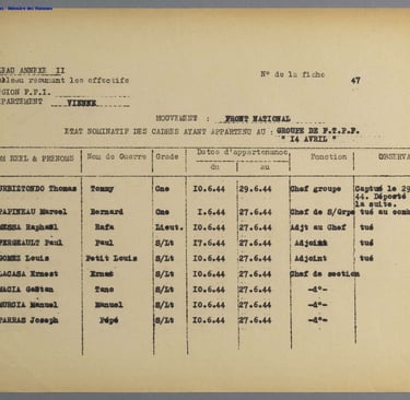 El grupo era una pequeña internacional antifascista: españoles, franceses, italianos, armenios, portugueses, belgas. En la cúspide, Marcel Papineau (“capitán Bernard”) y Tomás Urbiztondo coordinaban las operaciones. A su alrededor, combatientes experimentados —Luis Gómez Castaño, Manuel Murcia, Ernest Lacasa, Gaston Macià— dirigían pequeñas unidades. Y en la base, hombres como Juan Bautista Queralt, Antonio Serra, Rafael Massa o Vicent Rosell sostenían el peso físico de la lucha.